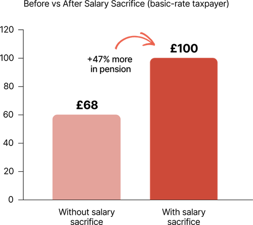Without salary sacrifice, £100 gross salary shrinks to £68 after tax and NI, and you can't recover the NI if you contribute it to your pension. With salary sacrifice, the full £100 goes into your pension, but your take-home pay only falls by £68 – a 47% improvement in value for the same personal cost.
